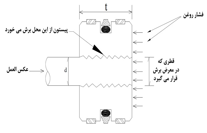 2- قطر داخلی سیلندر با کیفیت Ra 4/0 باید پرداخت شود. قطر بیرونی پیستون نیز تا جایی که امکان دارد باید صاف و صیقلی باشد. هنگامی که آنها با یکدیگر در تماس لغزشی می باشند، یک لایه روغن فشرده بین آنها وجود دارد که منجر به ایجاد اصطکاک زیاد و حرارت موضعی می گردد. به همین دلیل روی سطح قطر بیرونی پیستون باید شیار مناسبی جهت نگهداری روغن، میان پیستون و سیلندر وجود داشته باشد.